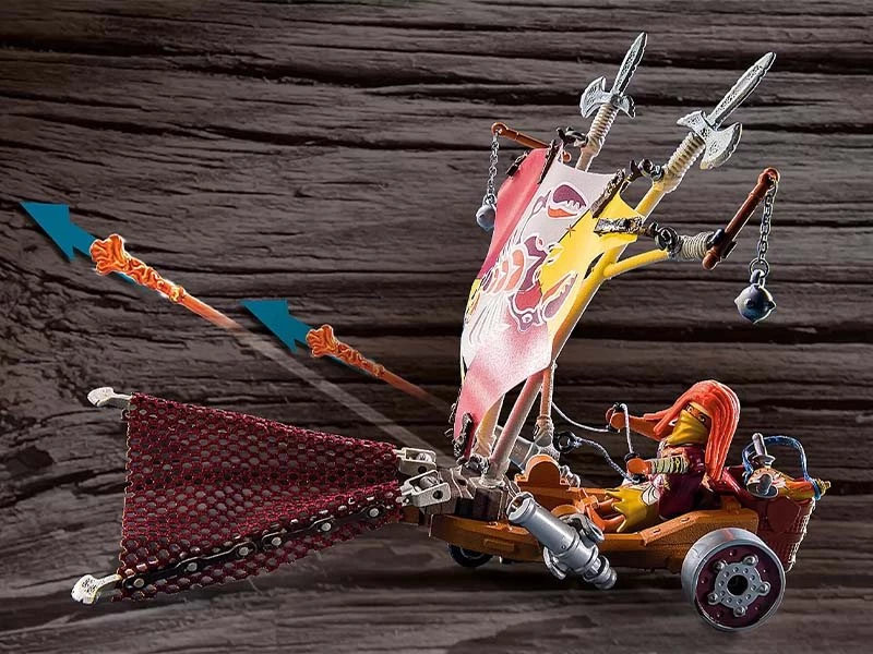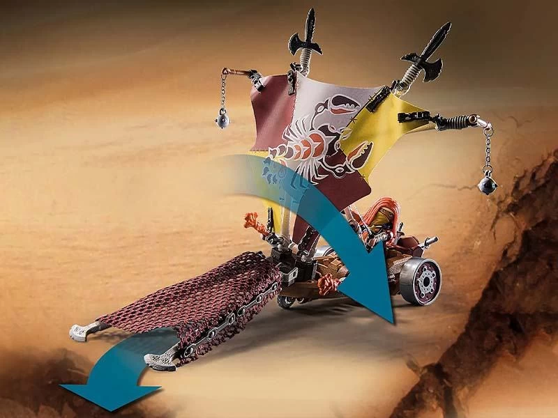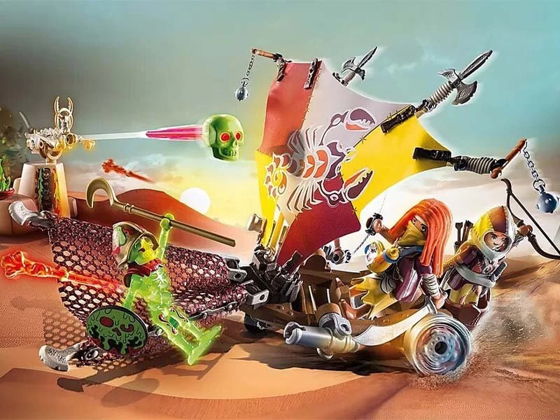 Dos combatientes se defienden de un guerrero Esqueleto. Extienden hábilmente la red desplegable de la parte delantera y atrapan al sorprendido Esqueleto. El vehículo Duna está equipado con dos cañones, así como con un nuevo sistema de dirección integrado que lo hace especialmente rápido y flexible. Pero el Esqueleto también sabe defenderse con su cañón de calavera.
