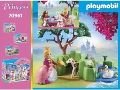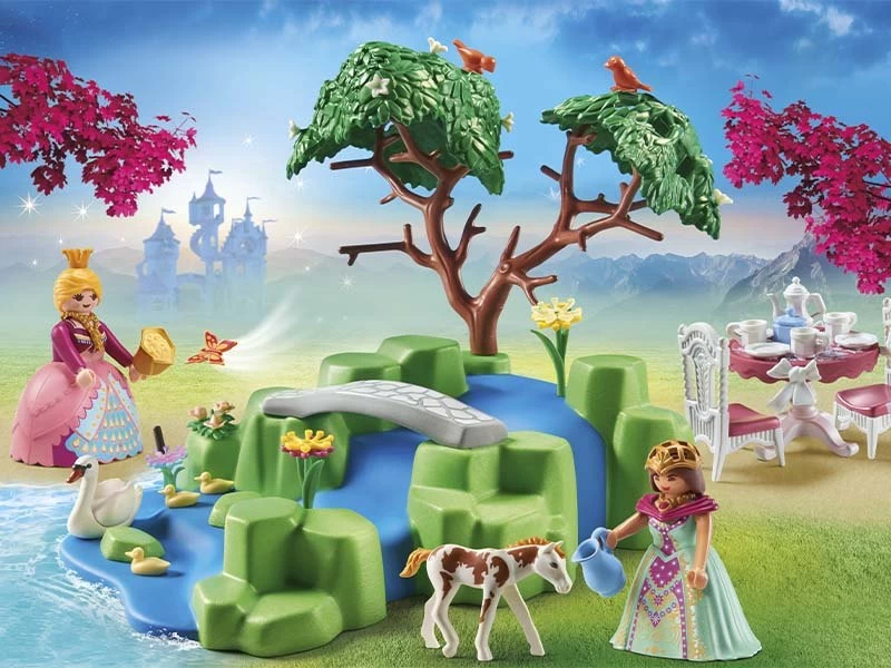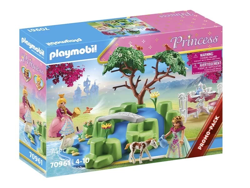 El set incluye dos figuras PLAYMOBIL, un estanque con puente, un potro, un cisne, dos sillas, una mesa y muchos otros encantadores extras para un juego de rol imaginativo en la habitación de niños y niñas. Las faldas, la corona y el adorno del pelo son desmontables. Las figuras pueden, sin faldas, sentarse en las sillas y llevar taza y jarra en la mano. Se puede jugar con el Promo Pack Princesas solo o combinado con otros playsets de PLAYMOBIL