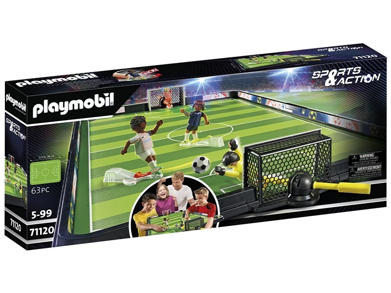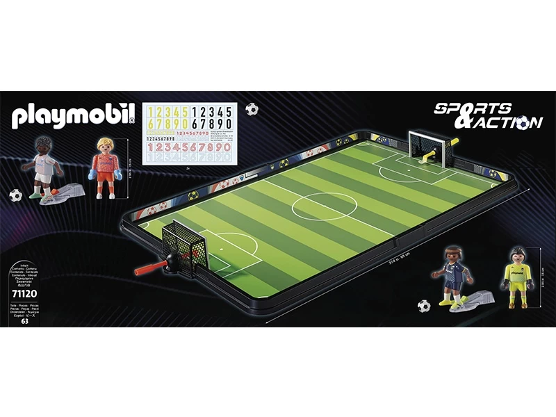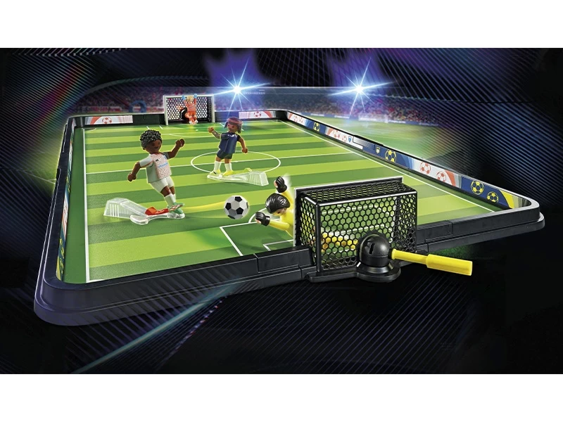 Vive la fiebre del fútbol con el estadio de fútbol de PLAYMOBIL. Todos los jugadores llevan meses esperando el gran torneo y están deseando que empiece el partido. Después del calentamiento, entran en el campo de juego y puede empezar el partido. ¿Qué equipo ganará la copa? Gracias a la práctica función de patada, balones bajos y altos pueden colocarse con precisión. La puntuación se puede indicar en el marcador. Puede utilizar las etiquetas numéricas para pegar el número de su jugador favorito. Un gran set de juego para los niños amantes del deporte. El set de juego contiene dos jugadores de fútbol con función de patada y dos porteros, tres balones de fútbol, un marcador, hojas de etiquetas y muchos otros extras para una emocionante diversión de patadas en la habitación de los niños.