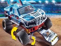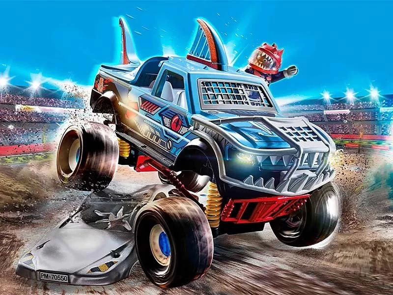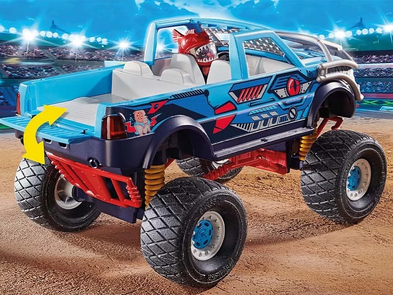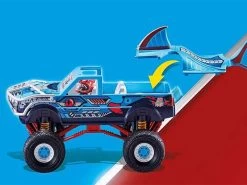 隆El Stunt Show Shark Monster Truck es pura adrenalina para los fans de la acci贸n! El ingenioso dise帽o con una elegante aleta en el techo, el peligroso radiador con mordedura de tibur贸n y el parabrisas hacen que el Shark Monster Truck sea inconfundible. Con sus ejes totalmente suspendidos y sus ruedas que se adaptan a cualquier superficie, el Monster Truck puede manejar las acrobacias y los obst谩culos m谩s dif铆ciles. El temerario especialista no escatima en riesgos y conduce con 铆mpetu. 隆Este peso pesado es imparable!