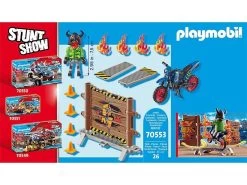 Cuando se trata de acrobacias espectaculares, el motorista no es menos que los pesos pesados. El intrépido conductor, adicto a la adrenalina, no rehúye de ningún desafío. A toda velocidad, corre por una rampa directamente hacia la pared con fuego. Este piloto de acrobacias no teme ni a las llamas ni a la velocidad. El set contiene un motorista de PLAYMOBIL, una moto con salto de esquí y pared de tabla variable, casco, guantes, bufanda y otros extras.