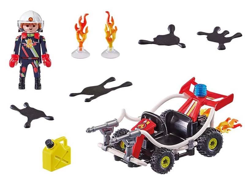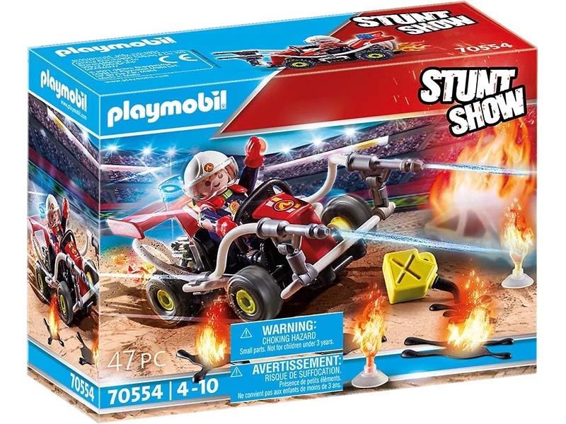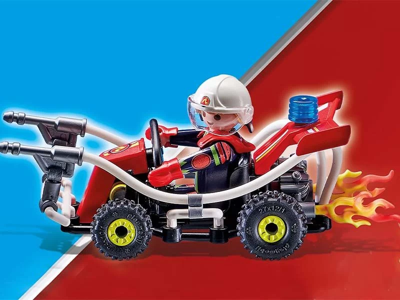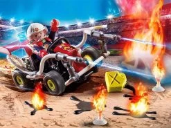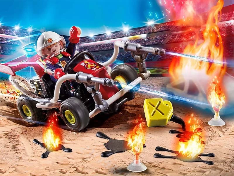 Las llamas a menudo se reavivan durante un stunt show. Sin embargo, si se vuelve muy peligroso, el Stuntshow Kart Bombero está preparado para actuar. El kart está equipado con dos lanzas de fuego. Con este quad incluso los incendios pueden ser controlados en poco tiempo. El set incluye un bombero PLAYMOBIL con casco y guantes, mangueras, botes y otros extras.