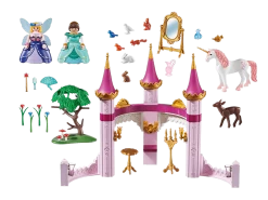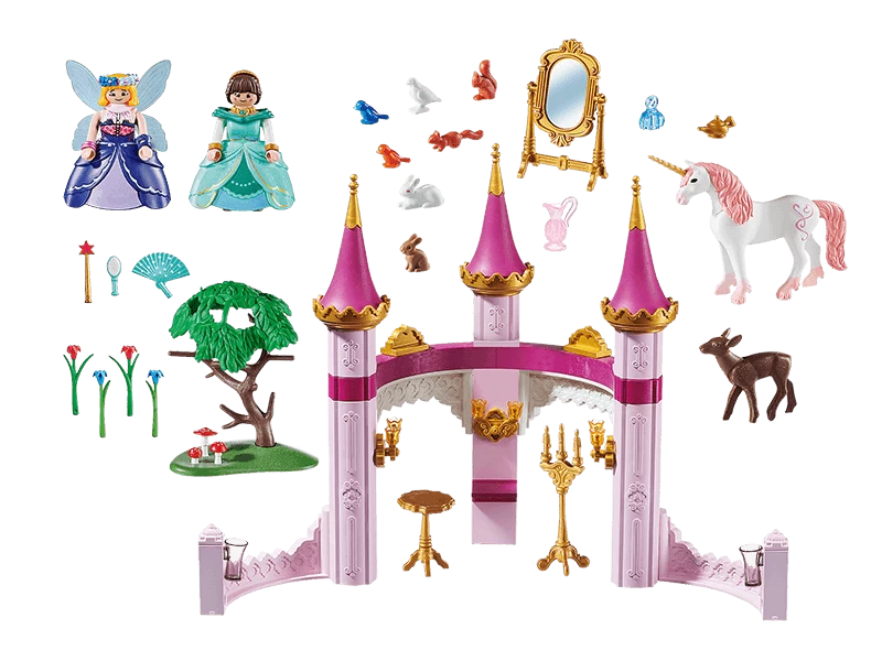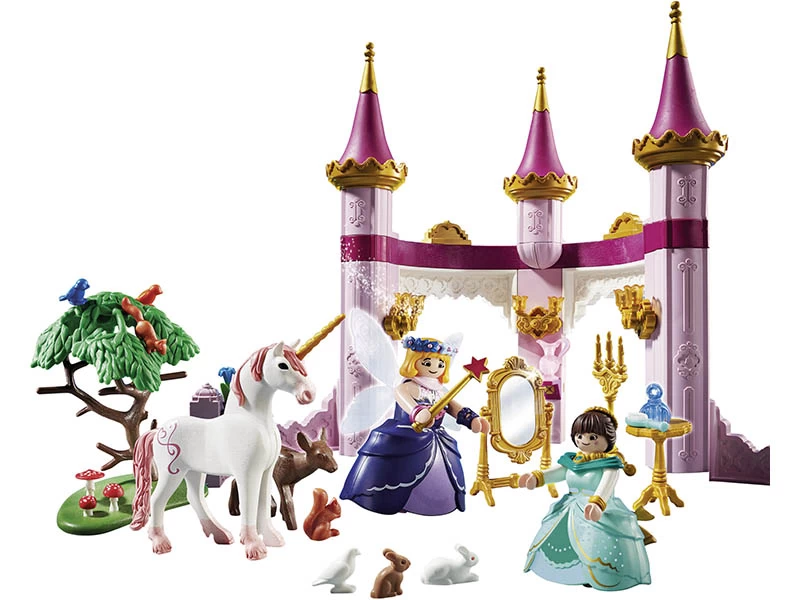 Marla con vestido de gala y el hada buena en el Palacio Cuento de Hadas. Con muchos accesorios, con adorables animales y un unicornio.