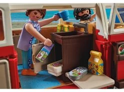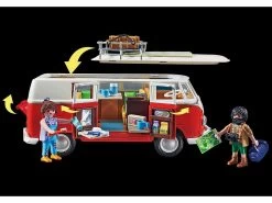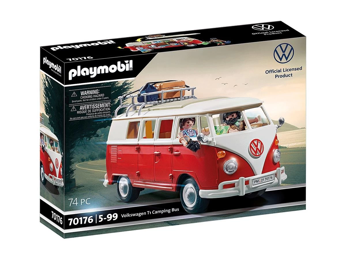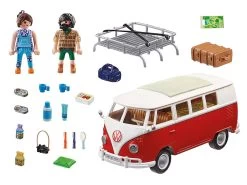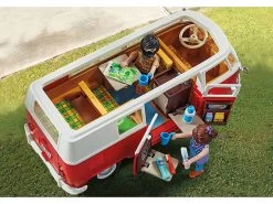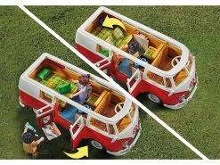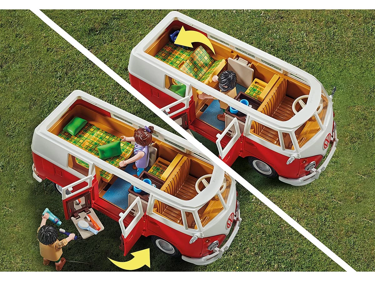 Un icono en la carretera: el Volkswagen T1 Camping Bus. Amado por generaciones. Incontables aventureros han viajado por el mundo en este camping bus. Por supuesto, también la versión PLAYMOBIL tiene muchos detalles caracterÃsticos, como el frontal iconográfico en forma de V con separación de colores rojo y blanco y el logotipo rojo de VW, el techo redondeado, el parabrisas dividido y la baca del techo desmontable. Al abrir la sección del techo, el interior se hace visible. Con un estilo auténtico, el interior de la T1 ofrece una mesa plegable con dos asientos y un lavabo con nevera. Los bancos con el tÃpico diseño de cuadros de los años 60 pueden convertirse en un área de descanso para dos personas. Las puertas laterales también pueden abrirse, una puerta incluye un estante para la comida y la otra un estante con bisagras y un espejo. El Volkswagen T1 Camping Bus: ¡sube, conduce y disfruta de la libertad! El set contiene dos figuras PLAYMOBIL, un Volkswagen T1 Camping Bus con techo desmontable y maletas, interior detallado con mesa de comedor plegable, asiento trasero plegable, puertas laterales con espejo y espacio para la comida y muchos otros extras.