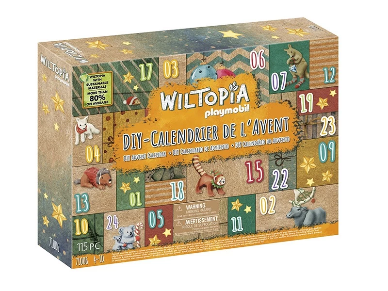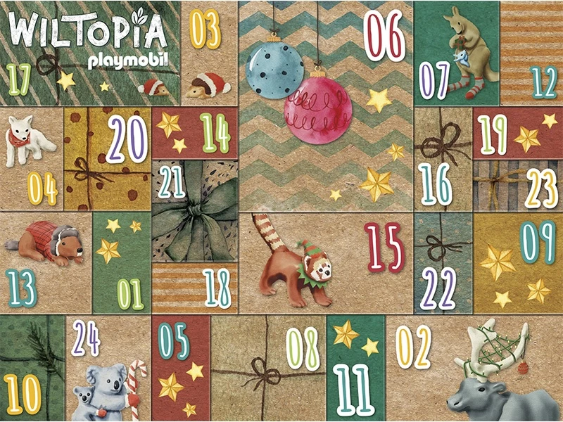¡Descubre los animales del mundo antes de Navidad! Con el Calendario de Adviento PLAYMOBIL Wiltopia DIY puedes conocer la gran variedad de animales que viven alrededor del mundo. Cada dÃa se puede descubrir y explorar uno de los 23 animales de diferentes partes del mundo y su fascinante hábitat. Las cajas del Calendario de Adviento DIY se llenan individualmente. Si se da la vuelta a la caja después de abrirla, se crea un sorprendente panorama animal con los hábitats de los animales incluidos durante el periodo de Adviento. Incluye una hoja de pegatinas con letras e imágenes de animales, que puede utilizarse para decorar las cajas individuales. Gracias a los contenidos educativos adicionales de audio y vÃdeo, Wiltopia une el juego y el aprendizaje de una manera única. Wiltopia – Maravilloso para el medio ambiente Wiltopia es la primera gama de productos PLAYMOBIL fabricada con una media de más del 80% de material sostenible. Los residuos de plástico desechados tienen una nueva vida y sirven como fuente de material para este extraordinario mundo de juego. Asà se conservan los recursos y, sobre todo, el medio ambiente. Por supuesto, todos los productos Wiltopia cumplen con los altos estándares de seguridad habituales y con la calidad y durabilidad probadas de PLAYMOBIL.
