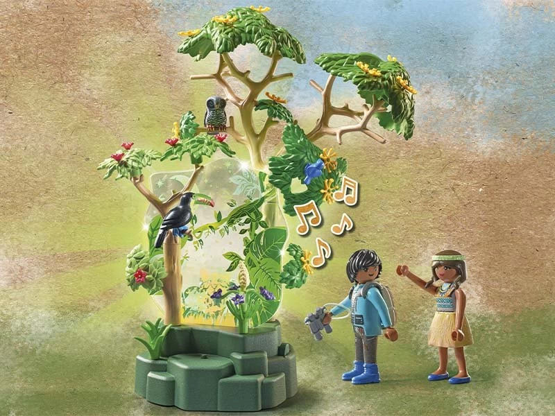 La luz nocturna simboliza la belleza y la diversidad de la selva amazónica y está pensada para que los niños y niñas puedan dormir cómodamente. La luz nocturna es también el lugar donde Rick y Alina se reúnen a veces para disfrutar del silencio de las. El set contiene dos figuras PLAYMOBIL Alina da Silva y Rick Palmer, una luz nocturna con sonidos de la selva, dos discos de motivos para cambiar, tucán, cárabo, una tarjeta de conocimiento de animales tucán y otros extras.