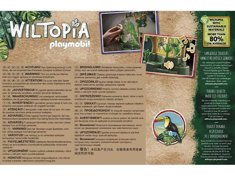 Wiltopia es la primera gama de productos PLAYMOBIL fabricada con una media de más del 80% de material sostenible. Los residuos de plástico desechados tienen una nueva vida y sirven como fuente de material para este extraordinario mundo de juego. Así se conservan los recursos y, sobre todo, el medio ambiente. Por supuesto, todos los productos Wiltopia cumplen con los altos estándares de seguridad habituales y con la calidad y durabilidad probadas de PLAYMOBIL.