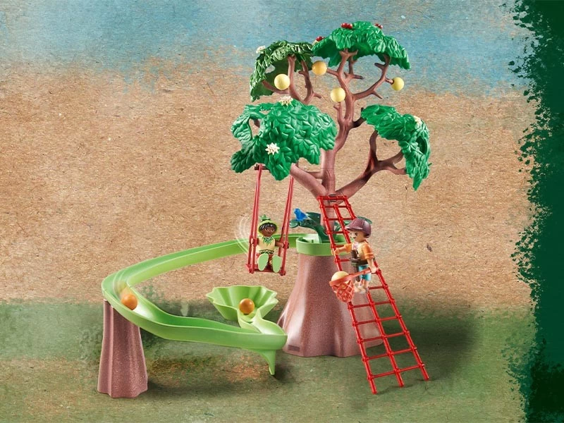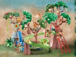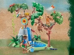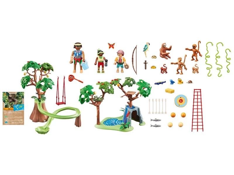 El set contiene tres figuras PLAYMOBIL, una placa base con árboles, un árbol con pista de bolas, un perezoso, dos monos araña con bebés, un bebé cocodrilo y muchos otros grandes animales de la selva y extras para emocionantes aventuras de juego.