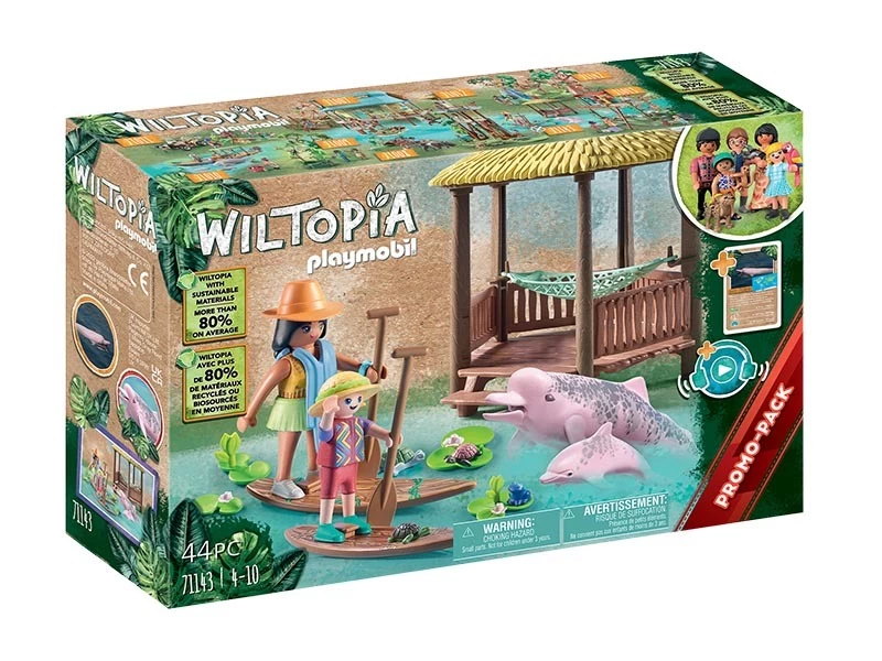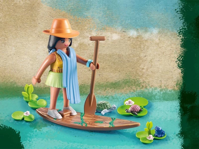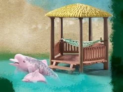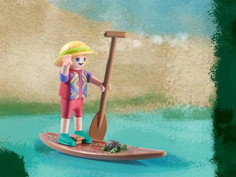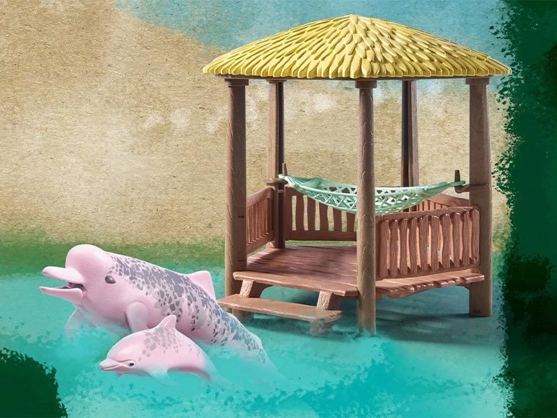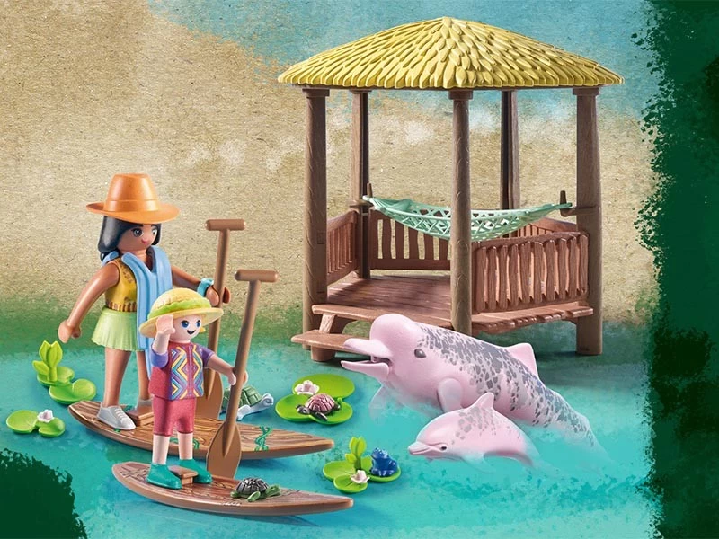 El set incluye dos figuras PLAYMOBIL, un delfín de río con una cría, una tortuga con crías, dos tablas con remos, así como una cabaña con hamaca y muchos otros estupendos extras. Con un nuevo tamaño de figura para niños de 5,75 cm.