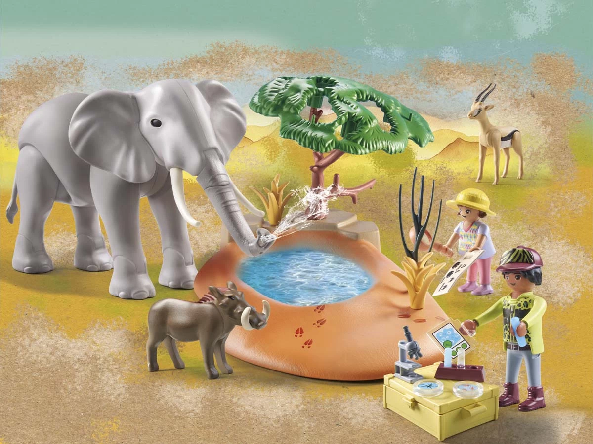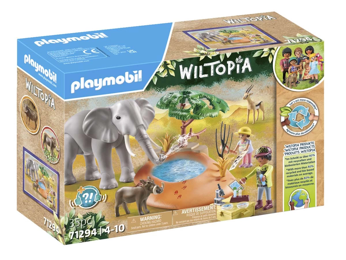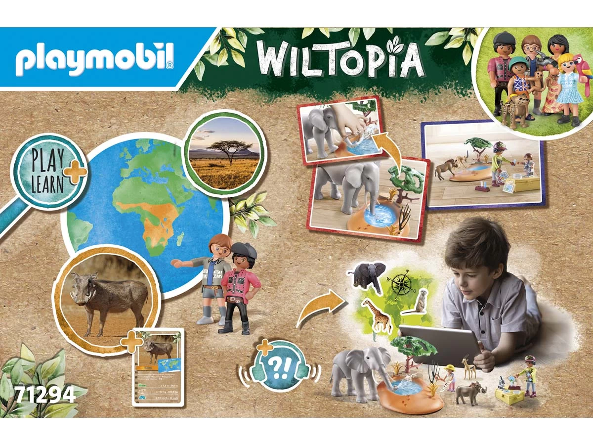¡Conócelo, quiérelo, protégelo! Descubre WILTOPIA, la primera línea de productos ecológicos de PLAYMOBIL fabricada con una media de más del 80% de materiales sostenibles. La última aventura lleva a la familia exploradora Palmer al Serengeti africano. Allí estudian el mundo animal y vegetal y aprenden muchas cosas nuevas sobre nuestro fascinante planeta. En la charca de la sabana, el gran elefante africano para para saciar su sed junto al jabalí verrugoso y la gacela. Con su trompa, el elefante puede beber agua y volver a expulsarla. Con las “tiras reactivas” adjuntas, los niños y niñas pueden investigar por su cuenta y “probar” la calidad del agua.